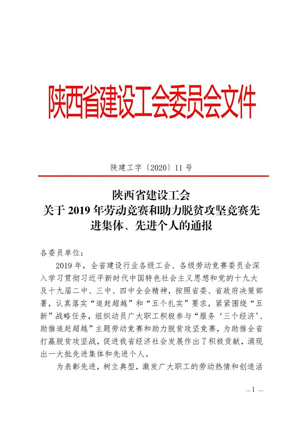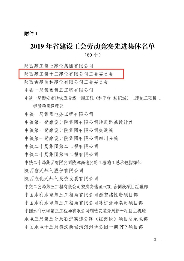 日前,陜西省建設(shè)工會通報表彰2019年勞動競賽和助力脫貧攻堅競賽先進集體、先進個人。陜建十三建公司工會委員會榮獲“2019年陜西省建設(shè)系統(tǒng)勞動競賽先進集體”稱號。