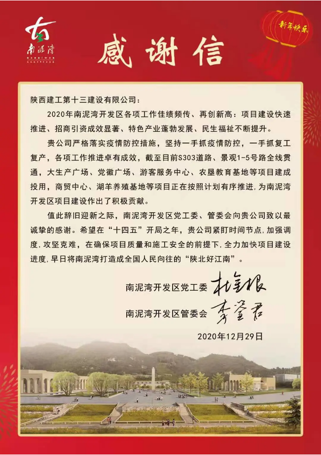 感謝信中提到,2020年陜建十三建公司嚴格落實疫情防控措施,堅持一手抓疫情防控,一手抓復工復產(chǎn),各項工作推進卓有成效,截止目前S303道路、景觀1-5號路全線貫通,大生產(chǎn)廣場、黨徽廣場、游客服務中心、農(nóng)墾教育基地等項目建成投用,商貿(mào)中心、湖羊養(yǎng)殖基地等項目正在按照計劃有序推進,為南泥灣開發(fā)區(qū)項目建設作出了積極貢獻。