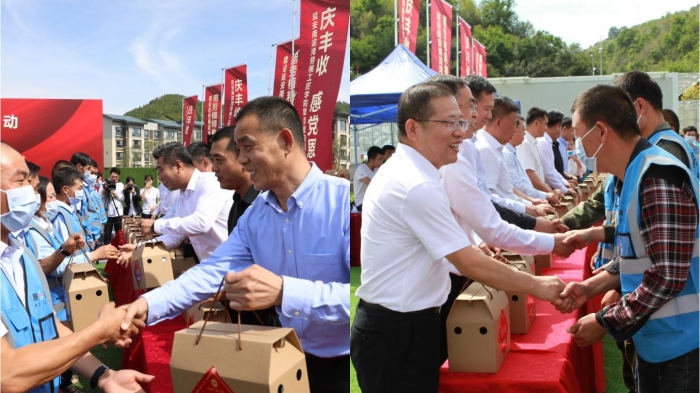 慰問活動現(xiàn)場,與會領(lǐng)導(dǎo)為農(nóng)民工朋友們發(fā)放慰問品,并隨后觀看了“慶豐收、感黨恩”慰問演出。