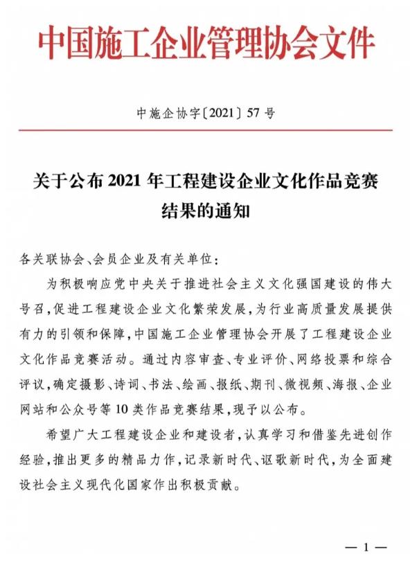 集團(tuán)官網(wǎng)、微信公眾號攬獲2021年工程建設(shè)企業(yè)文化作品競賽獎項
